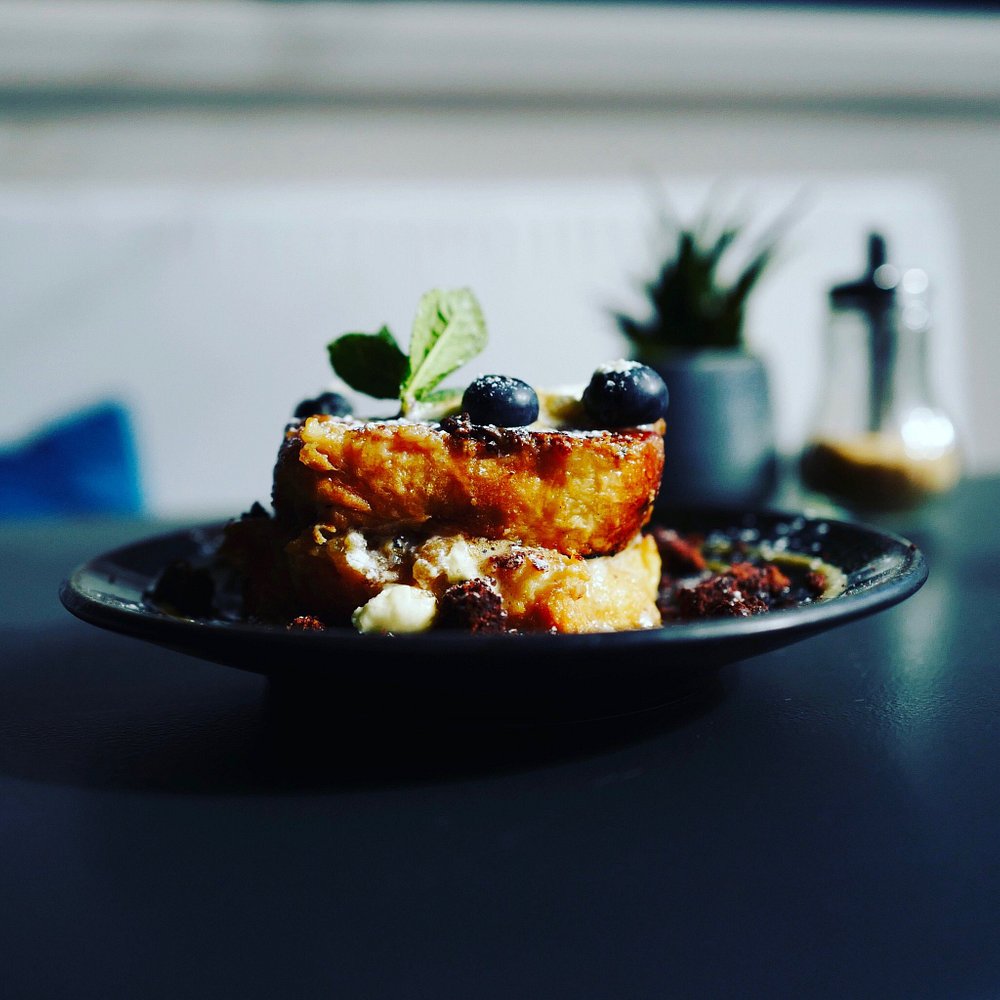 Maison « Bonnaire » façon pain perdu, caramel au beurre de cacahuètes, bananes, éclats de cacahuètes grillées